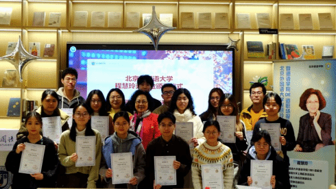 会见结束后,北京外国语大学程慧玲奖学金颁奖仪式在东校区图书馆学生书吧举行。程慧玲与本硕博获奖学生欢聚一堂,共同见证这一温暖时刻。仪式现场气氛温馨而热烈,洋溢着浓浓校友情怀的同时彰显了不变的育人初心。