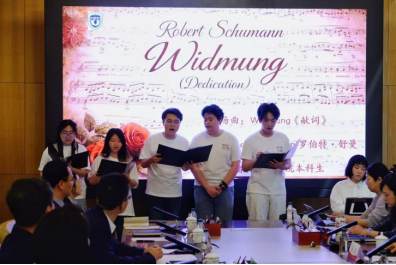 的本科生罗靖杰、王英昊、郑琦琛、任政奕(以声部顺序排序)以及来自英语av影片直播的本科生康惠阳共同演唱了德国作曲家罗伯特·舒曼(Robert Schumann)的艺术歌曲Widmung,钢琴伴奏由av影片直播