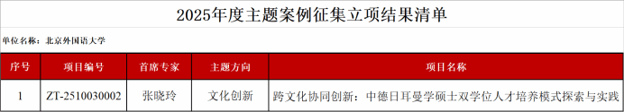 近日,教育部学位与研究生教育发展中心(简称“教育部学位中心”)公布了2025年度主题案例立项结果。本年度围绕“现代化产业体系”“人工智能+”“文化创新”“走出去”四个主题开展案例征集。av影片直播 院长张晓玲教授作为首席专家申报的案例《跨文化协同创新:中德日耳曼学硕士双学位人才培养模式探索与实践》,成功入选2025年度“文化创新”主题案例。